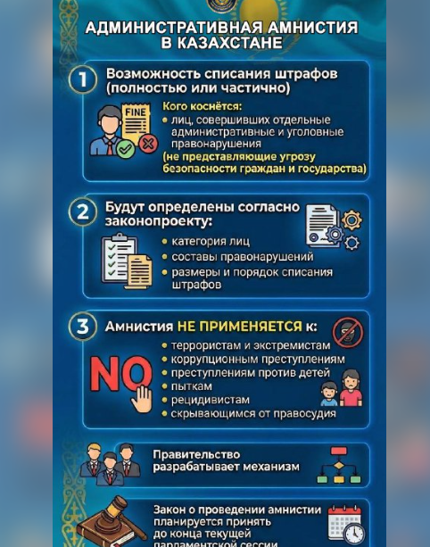 Ел тарихында алғаш рет әкімшілік амнистия өткізу қарастырылып отыр. Оның аясында жеке тұлғалардың орындалмаған әкімшілік айыппұлдарын толық немесе ішінара есептен шығару мәселесі қаралады.